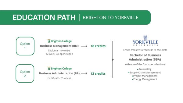 Yorkville’s British Columbia campus is located in downtown Vancouver. Brighton College Business students who complete either Advanced Business Management, Business Management, or Business Administration diploma are able to transfer to Yorkville with varying credit transfers into their Bachelor of Business Administration.